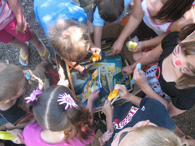 Because the kids have a lot of friends and are very social and we love to be inclusive, we had over 45 kids at the party. The ages of the friends ranged from 15 months to 14 yrs. Most kids were between 2 and 6 yrs. I divided the older kids (7 or older) and the younger kids into "helpers" and "participants." When I made the invitations, I taped on a little piece of paper saying I needed lots of helpers for this party and invited the older kids in the families to be my assistants. I got a great response from everyone. The older kids definitely wanted to be involved. Some even came over to my house throughout the week to ask what they were going to be able to help with. Some gave requests to be in charge of certain games.
